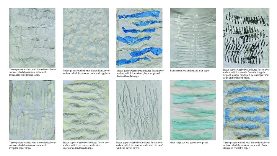The journey commenced with the treatment of various textures on 3D geometric tessellation through isometric perspective. Later the goal of adding texture in the shapes of 3D geometric tessellation got accomplished with tie dye yarns in